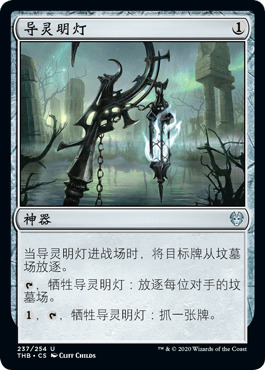 综合来看,笔者认为这张导灵明灯是对此套牌最为靠谱的坟场针对。它不像祖神兽遗宝/得享安息那样自伤。执持化尘吃墓地,自伤同时遇到对方坟场针对一点用也没有。黑地脉则过于荒谬了。这张明灯本身是神器,能提供躁狂。有墓地AOE在很多情况下优于一次一张的翻检爪。同时其还能以较为低廉的价格循环出去。缺点就是难以操控。不过本来这套牌就很吃决断,用这牌的人大概都在享受决策吧……