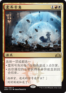 能解决绝大多数问题的扫。目前环境并用不上4费硬扫,因为生物套都是以小人配合为主。3费扫中,震耳号角优于众神之怒,其优点有三:一是不误伤我友军通念师老练人方便坟墓利用;二是均三色卡组红白比红红好凑,三是提供系命异能偶能救君于水火。