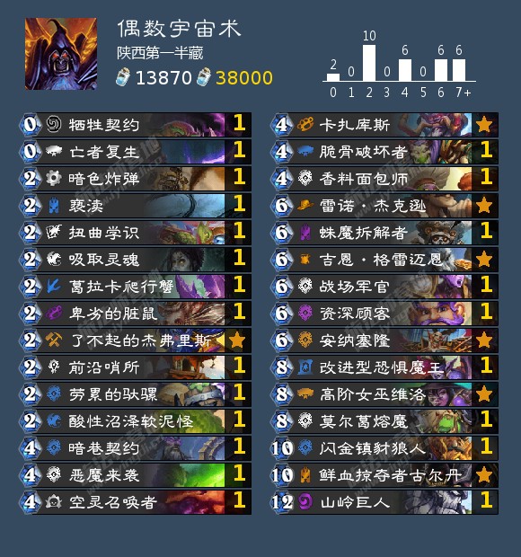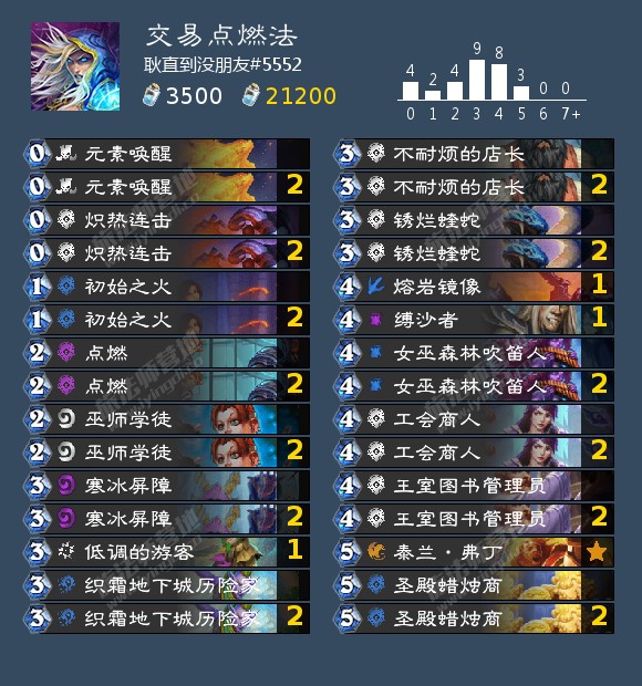 来自耿直到没朋友#5552(B站同名id,每天都会直播一会,欢迎围观)的一套交易点燃法,他使用这套卡组对阵任务术几乎全胜,打到了传说1000+名。