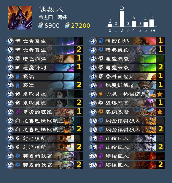 投稿人并没有分析卡组构筑,但好在我本身也是一个偶数术玩家。根据经验来看,投稿人理解相当到位,这套构筑非常扎实,必需满编的牌和只取其一的牌都恰到好处。卡组舍弃了异教低阶牧师并只带了1张蛛魔拆解者。低分段的任务类卡组玩家容易疏忽,卑劣的脏鼠和恶魔计划发挥不会差,并且能有效针对otk类法贼。