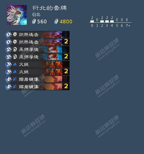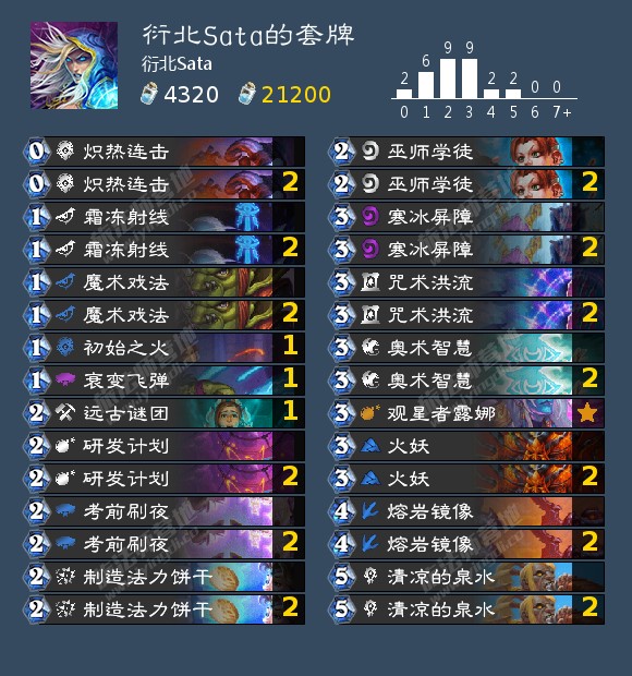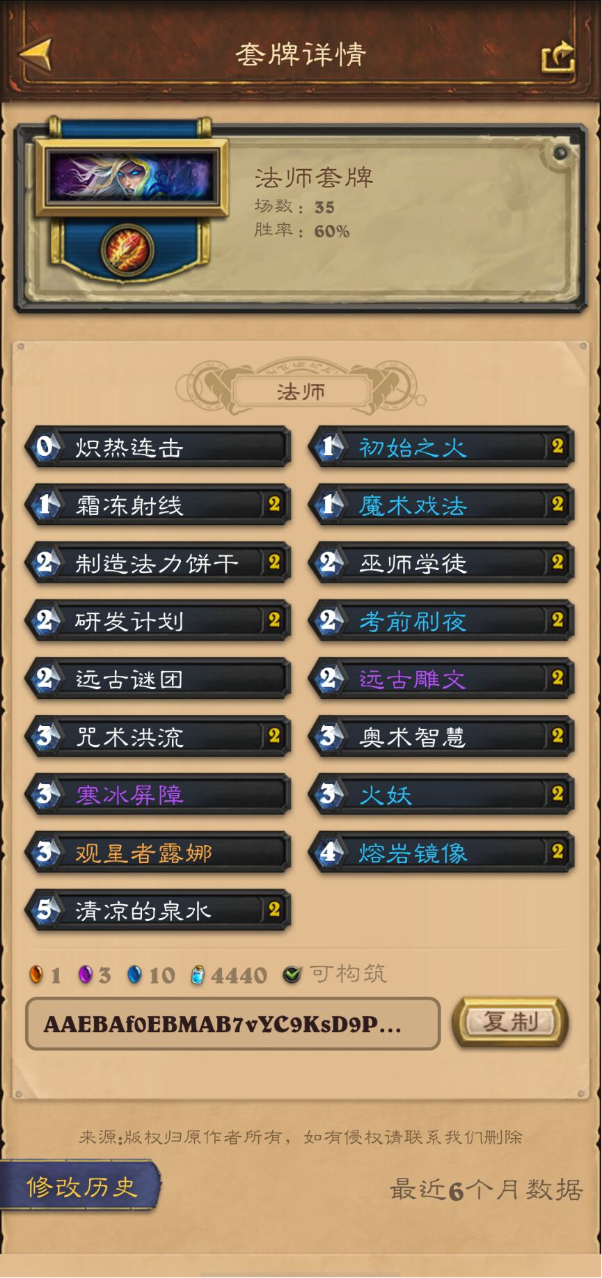 修改:在上次的基础上,我把一张炽热连击加到了两张。一开始我并不觉得火妖法非常缺费用,但在经过快攻的强烈攻势,常常是我们后手四费就被破冰了,五费启动单火妖又打不死人的情况下,我加了一张增加了我们胡牌的概率。而在面对中速的情况下,两张炽热连击卡手的情况基本也无伤大雅。