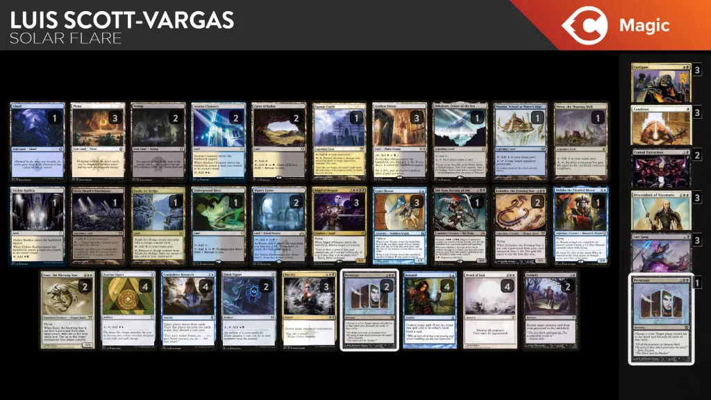 我们没有决定使用什么套牌,但在比赛前一天晚上我们注意到了Solar Flare套牌,这是一套艾斯波色的Tapout控制套,里面有很多抓牌效应以及有意思的单卡。为了测试我们是否选对了套牌,我们拿它和我的特选工具箱打了一会(不过我们给了标准套牌几个回合让测试变得相对公平一些..)。而这些就是我们的T2套牌测试,我们的注册牌表如下: