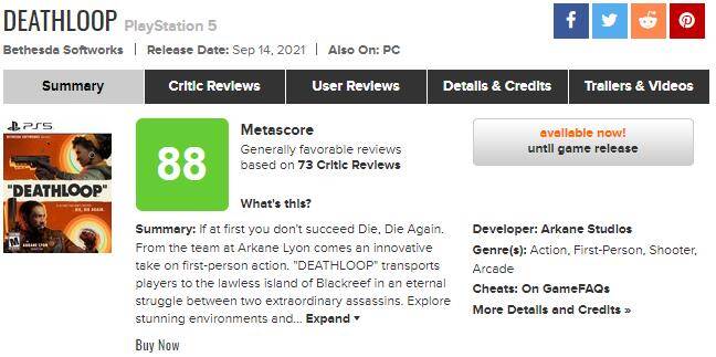 《死亡循环》获得了M站metacritic 73家媒体均分88分的总体评价,其中68家媒体给出好评,5家媒体给出中评,无差评。