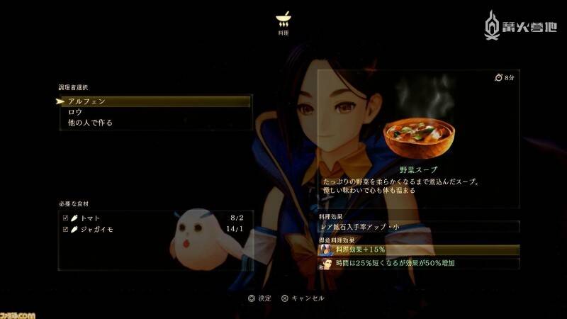 在游戏推进的过程中,画面左下方显示的「简短对话」也很有趣。尽管同伴有时会在剧情发展到一定程度时说些严肃的话题,不过总体来说都是些会让玩家噗嗤一笑的对话。比如说当玩家通过探索获得装备道具时,喜欢武器防具的奥尔芬就会热情地介绍起武器防具。再比如说,喜欢美食的希侬会对营地中的食材展现出极大的兴趣。这些对话为奥尔芬一行人的旅途增添了不少色彩,也加强了游戏整体的冒险感。