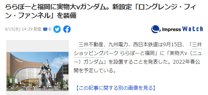 今天,三井不动产、九州电力以及西日本铁道联合宣布,将在位于福冈的巨型综合购物中心《Lalaport 福冈》门口设置全新实物大高达,本次选定了骡子的终极座驾RX-93ν高达,而该高达已经确定搭载新设定版长距离浮游炮,预定2022年春公开亮相。