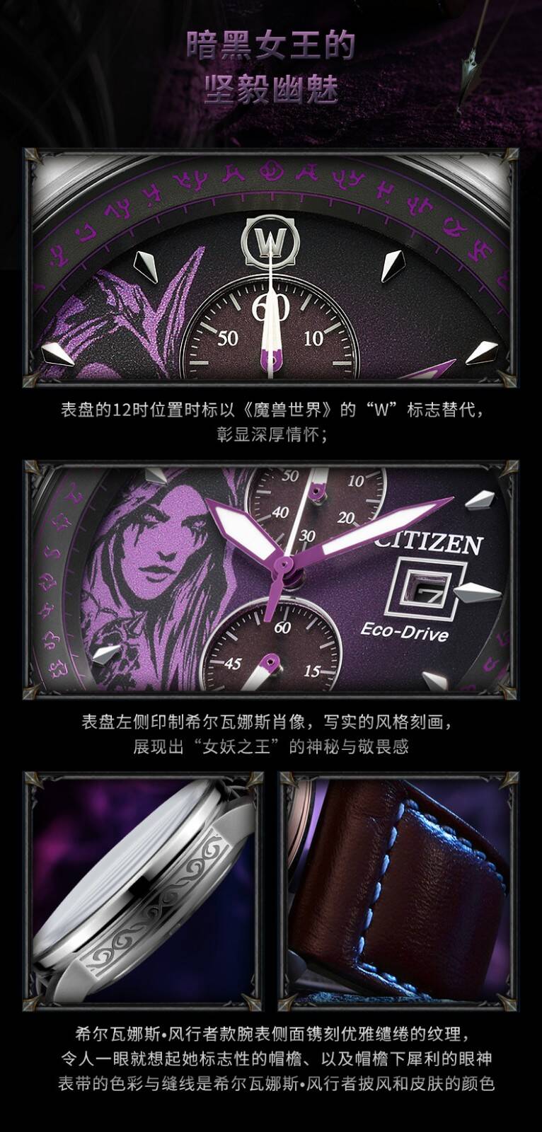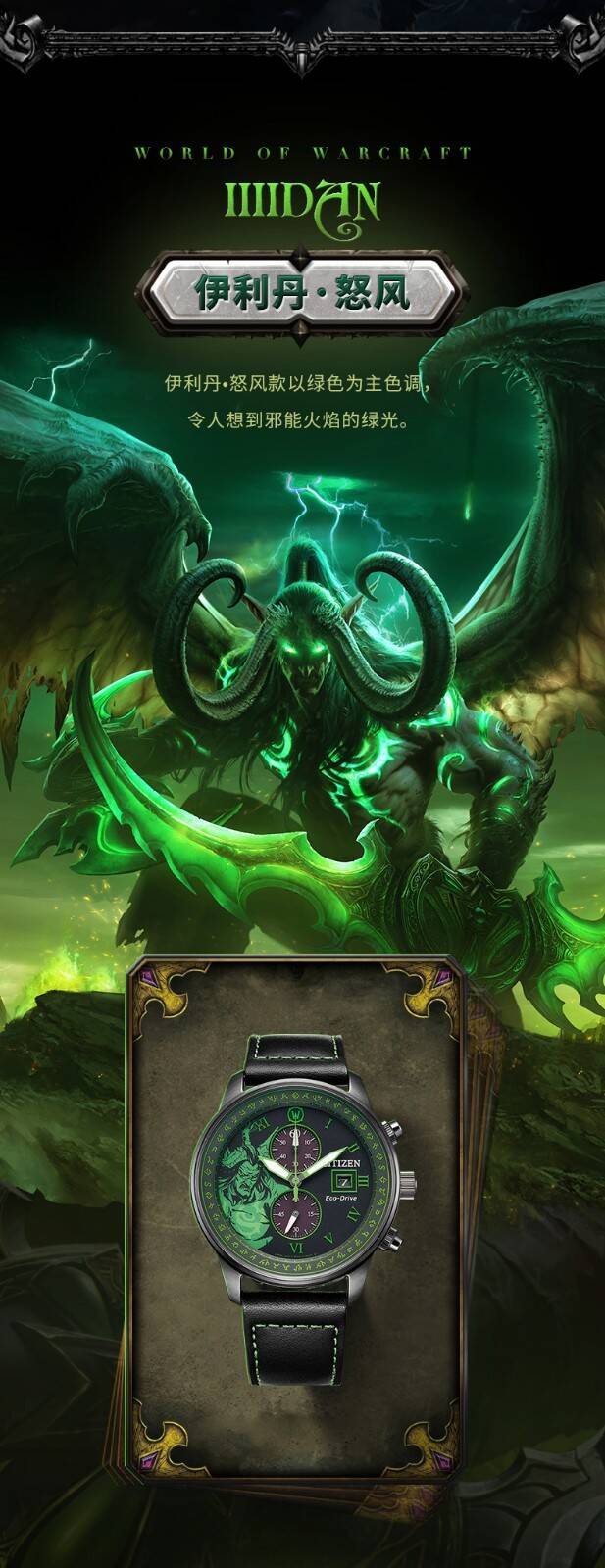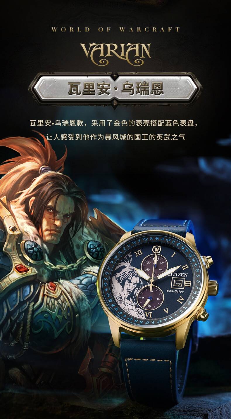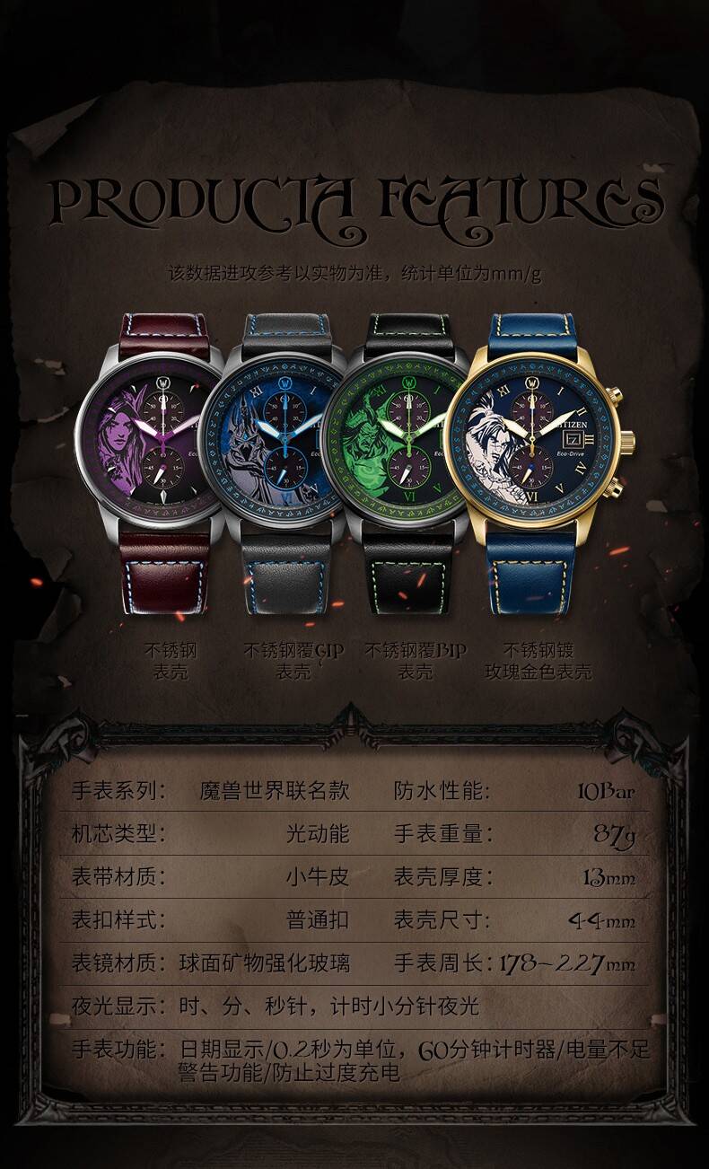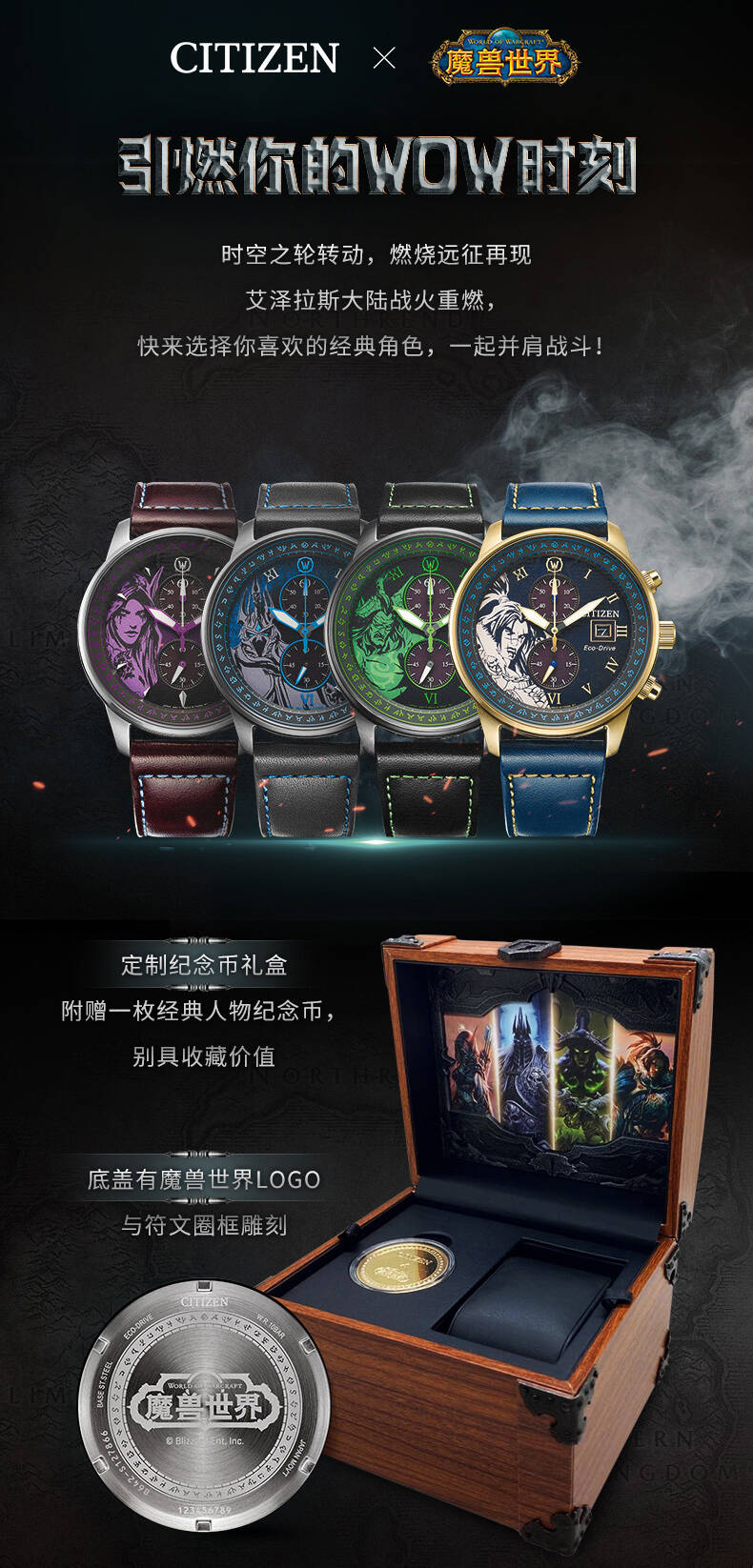 这四款手表以魔兽世界著名人物:伊利丹·怒风、巫妖王阿尔萨斯、瓦里安·乌瑞恩、希尔瓦娜斯为原型进行设计,售价为3130元。每一款手表都在表盘和边框等位置进行了独特设计,手表采用礼盒包装,同时还有纪念币和魔兽世界90天季卡加赠。