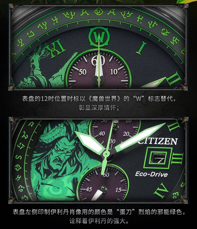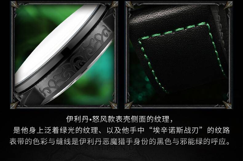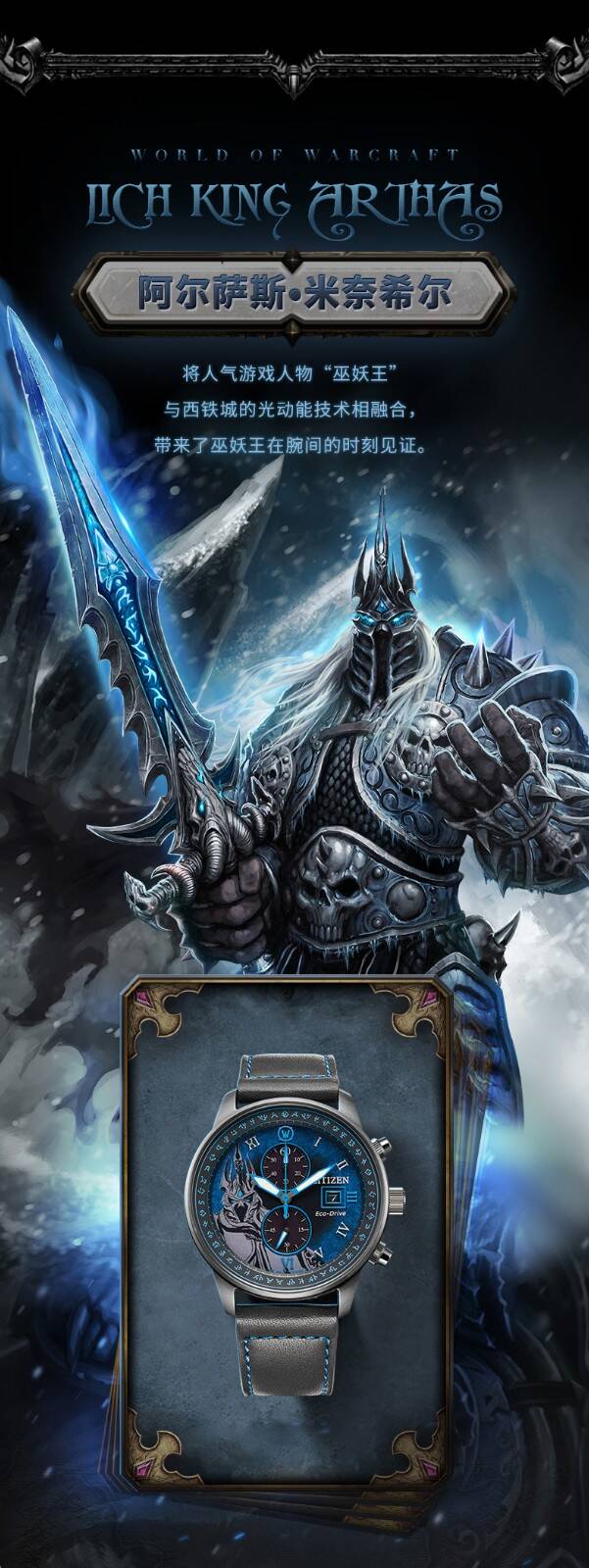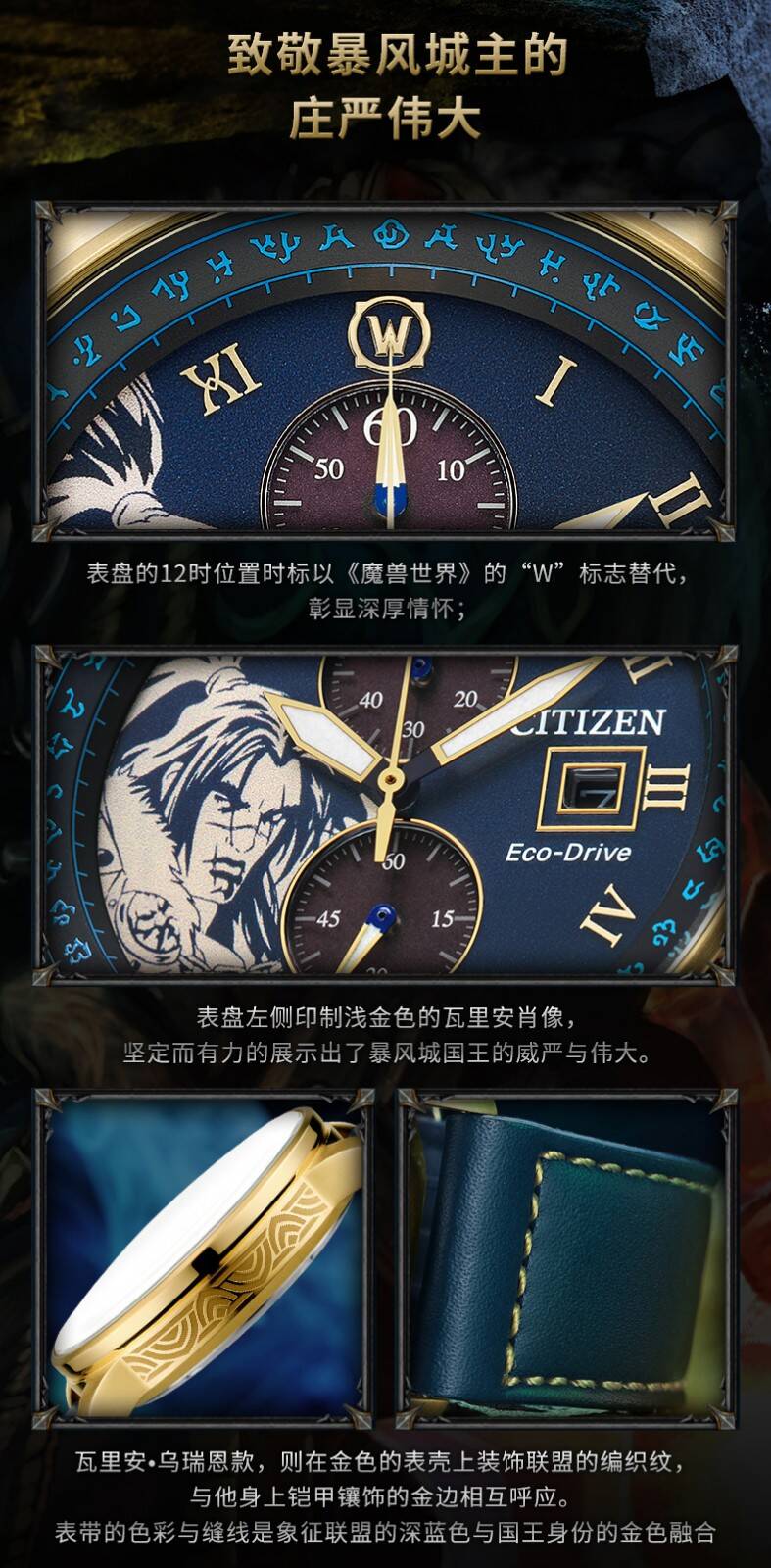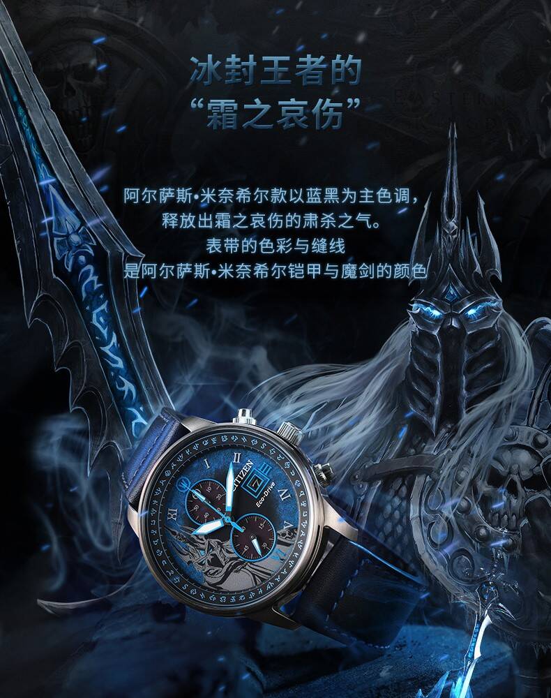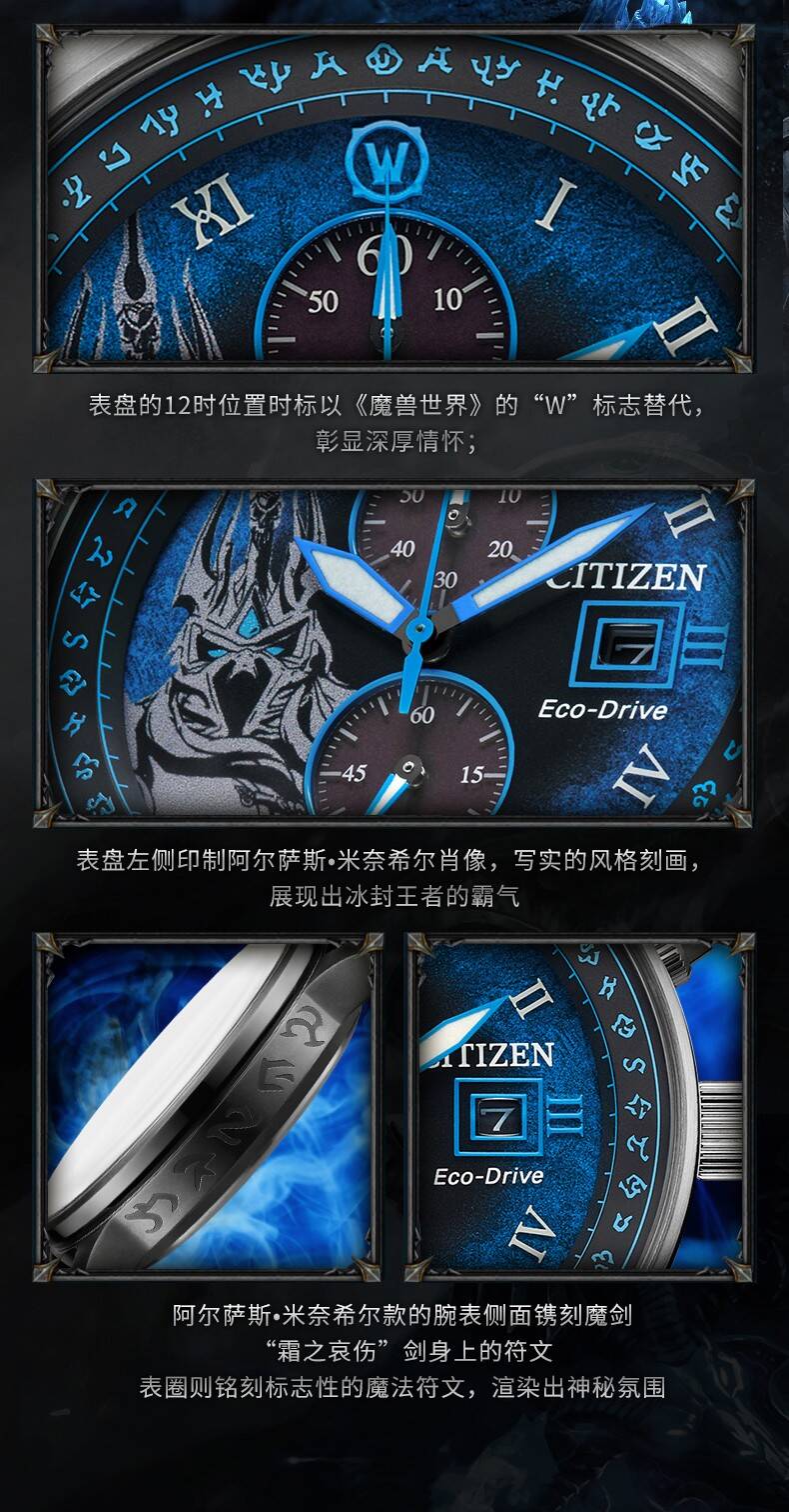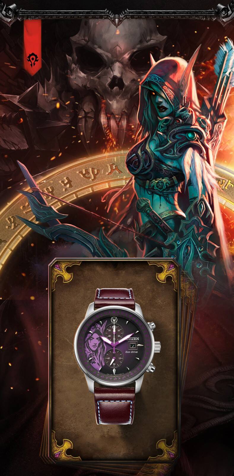 这四款手表以魔兽世界著名人物:伊利丹·怒风、巫妖王阿尔萨斯、瓦里安·乌瑞恩、希尔瓦娜斯为原型进行设计,售价为3130元。每一款手表都在表盘和边框等位置进行了独特设计,手表采用礼盒包装,同时还有纪念币和魔兽世界90天季卡加赠。