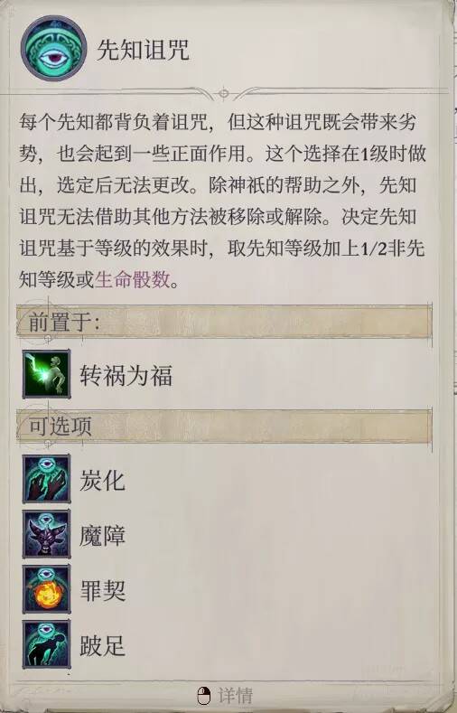 游戏有200多个职业分支,每个角色都有自己适合的修仙能力,同样,先知也是一种法术职业,与法师不同的是,先知不需要提前准备记忆法术,虽然同样有次数限制,但在战斗中任意选择所有掌握的法术都能释放,原因自然是他能“先知”道。不过作为代价,每个先知都有一个生来的残疾,瞎眼、跛脚、失声......颇为符合奇幻故事中的刻板印象,前者让所有远程招式几乎不可能命中,后两者则是让一些魔法无法释放,也就有了先知知识很多,但无能为力的戏剧性,成神之后,这些先天的残疾可以被选择治愈。