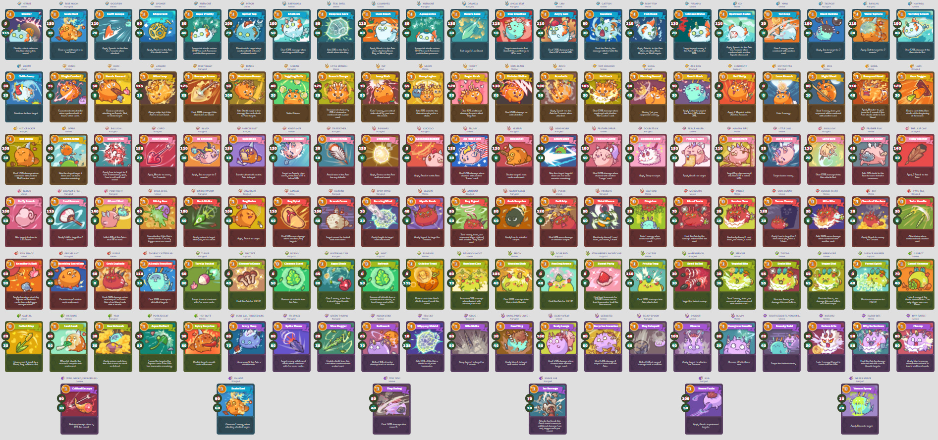 Axie 玩法上比较特殊的地方是,把卡牌融入在宠物的概念里,宠物本身有属性,每个宠物都有4种属性,每个属性都对战斗产生影响,具体会再后边的章节详细介绍。每个宠物影响技能的部位是,角(horn),嘴(mouth),背(back),尾(tail)4个部位,每个部位分别有一个基本种族技能。首先axie里一共有9个种族,6个基本种族,3个特殊种族,种族之间还有相生相克的关系,具体情况我们后文会讲。我们先了解下6个基本种族,分别是鱼(aquatic),兽(best),草(plant),鸟(bird),虫(bug),爬(reptile)。每个种族有6个角技能,4个嘴技能,6个背技能,6个尾技能,所以每个种族有22个技能,总共有132个技能,每个技能背后都代表一张卡牌,所以这个游戏本质就是以132张卡牌为卡池组建套牌的卡牌游戏。而每个宠物同一部位只能出现一个技能,所以,着相当于在构筑卡组时,对玩家进行了限制,限制后,组合变为,24个嘴技能,36个角技能,36个背技能,36个尾技能的搭配,每个玩家在战斗中可以带3个宠物,这就让看起只有132张卡牌的简单卡牌游戏产生了千变万化的可能性。具体的情况我们会在后续的构筑思路中更详尽的解释。