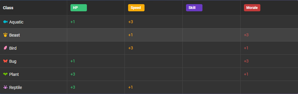 而种族之间是有相生相克的关系,爬,草,黄昏克制鱼,鸟,黎明;鱼,鸟,黎明克制兽,虫,机械;兽,虫,机械克制爬,草,黄昏。克制的种族打被克制的种族多15%伤害,被克制的种族打克制的种族少15%伤害,没有克制关系的种族伤害都是100%。