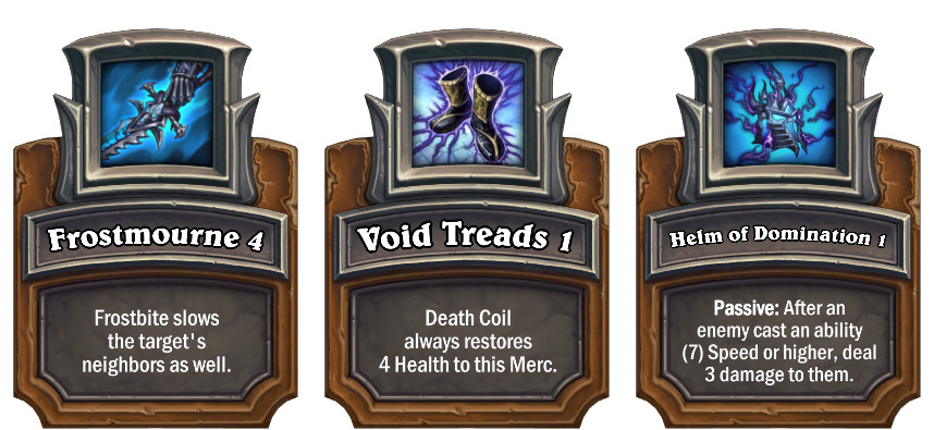 每位佣兵具有独特的3件装备。装备只能同时使用其中一个。装备效果可能与属性值/技能等相关。装备在游戏过程中获得(待更新具体方式)。装备拥有4个等级,需要通过佣兵硬币来升级。部分装备初始等级不为1。
