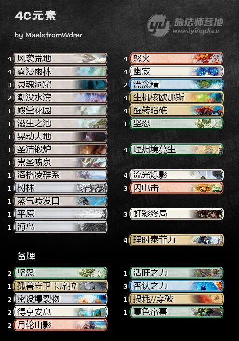 主要的运营核心自然是元素生物小宝贝们,非生物咒语则提供的是加速(理想境)、稳定(小泰)、解场(闪电击、虹彩终局)和combo(流光烁影)四种用处。这套牌大约有5个左右的卡位是可以随meta和个人喜好而变化的,如先兆炎身、闪电击、虹彩终局、小泰、漂念精的数量。