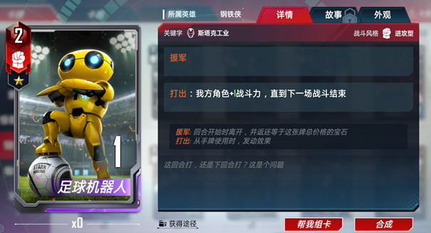 一般看来一张2费的卡牌合格的战斗力是4点。如果场上只有1个单位的时候,足球机器人提供的战力是3。所以最好是有两个以上的单位的时候再选择打出,如果第一回合它出现在商店中可以选择锁住,等待下回合再购买buff更多的角色。同时援军还可以回收购买时花费的2颗宝石,在前期是非常好用的单卡。