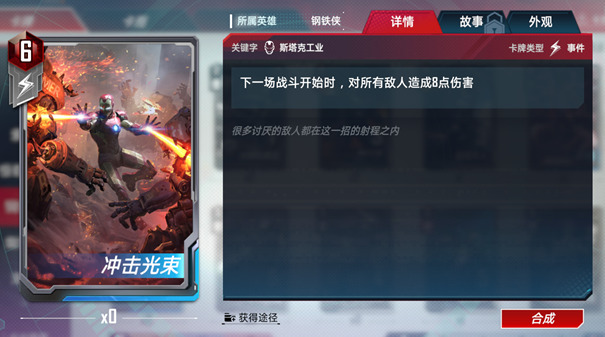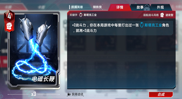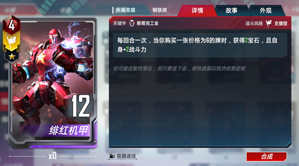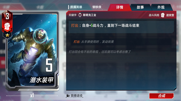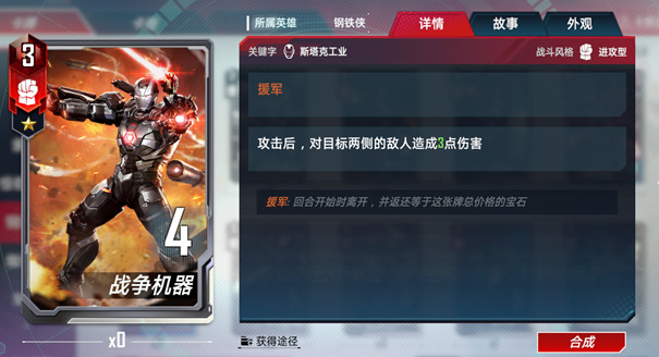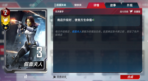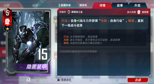 精准。当你出售一张斯塔克工业角色牌时,自身获得其战斗力★一半/★★一倍/★★★★两倍的战斗力,直到下一场战斗结束。