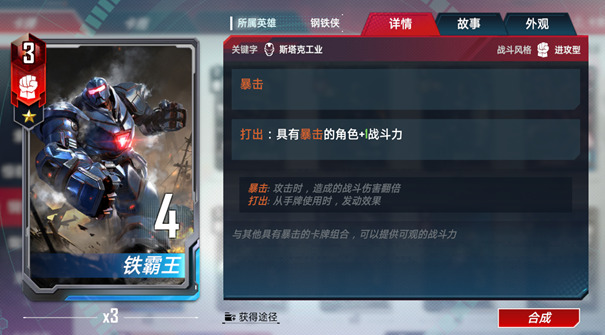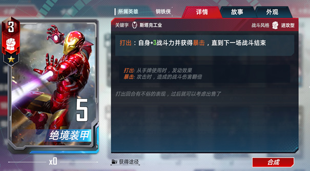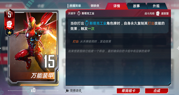 钢铁侠阵营的核心卡牌,所有具有打出能力的钢铁侠角色的最终归宿。当万能装甲在场时,各种打出效果都可以被复制。万能装甲不仅可以在战力上获得提升,还能获得类似暴击和精准这样的强力特效。在众多角色反复打出的过程中,万能装甲的战力有可能很快就突破100大关,成为所有对手惧怕的对象。