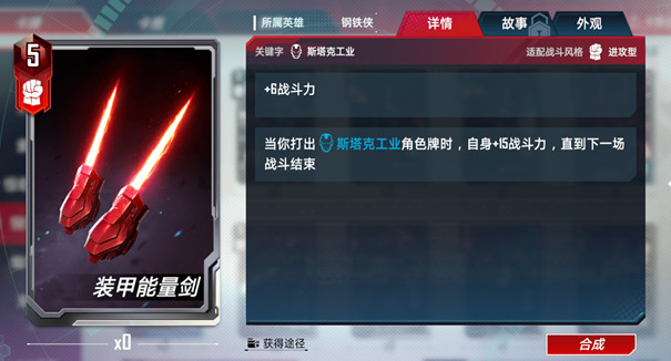 不得不说钢铁侠在5费的内容还是非常丰富的。这把武器也能做到单回合战力21的威力。不过如果从构筑的角度来讲,另外4张卡牌的优先级可能都在装甲能量剑之上。毕竟武器在其他的阵营中也获取。或者当钢铁侠作为辅助阵营出现时,装甲能量剑是一个非常不错的选择,瞬间拉高战力的效果可以让很多进攻型角色如虎添翼。
