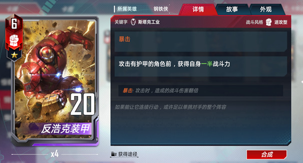 在漫威的故事中,托尼斯塔克就是考虑到浩克狂暴时毫无理性的破坏,设计了这款“反浩克装甲”作为终极保障。在游戏中浩克算是守护型角色的代表,他自身强大,也能为其他防御型角色带来更多的护甲,变得难以突破。而反浩克装甲就是这类卡组的克星,身材本就不俗的反浩克装甲自身还拥有暴击的效果,并且在打击有护甲的目标时,身材还能成倍的膨胀。对于仙宫体系有着非常强大的压制力。