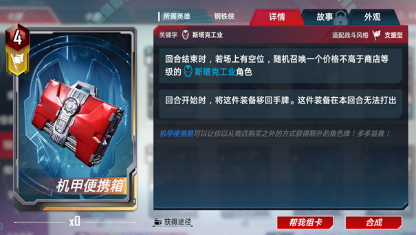 回合结束时,若场上有空位,随机召唤一个价格不高于商店等级的斯塔克工业角色。回合开始时,将这件装备移回手牌。这件装备本回合无法打出。
