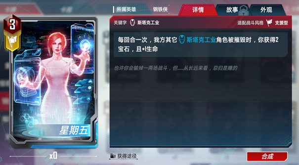 如果将钢铁侠作为一个辅助阵营应用到卡组中,星期五就是一个非常不错的选择。花费3颗宝石,即能提供宝石又能恢复生命可以说相当划算。不过因为钢铁侠阵营中没有防御型卡牌,所以想要稳定触发最好还是场上多一点钢铁侠的角色。