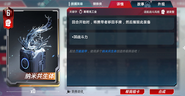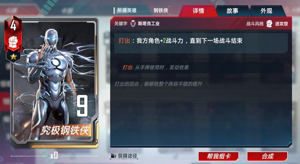 在己方场上有6个角色的时候单卡提供的总战力当回合可以达到惊人的21点。虽然这跟自身战力21相比略有逊色,不过依然是个非常扎实的效果。并且在后期资源比较充分的情况下,将究极钢铁侠升星并不算难,所以无论是让他作为一个临时的发育点或是后期的常驻卡牌都是可以选择的。最重要的是它是万能装甲的绝佳搭档之一,万能装甲有了他的帮助能永久具备它的打出效果,提升整个团队的战斗力。