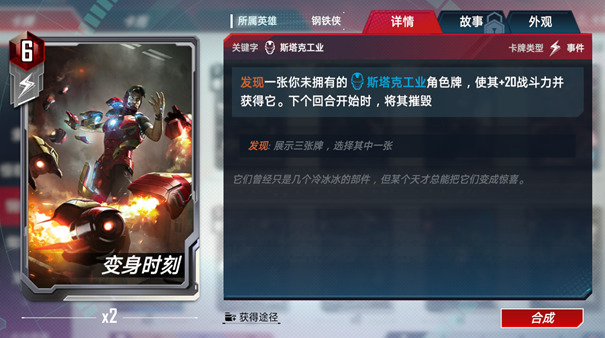 发现一张你未拥有的斯塔克工业角色牌,使其+20战斗力并获得它。下回合开始时,将其摧毁。