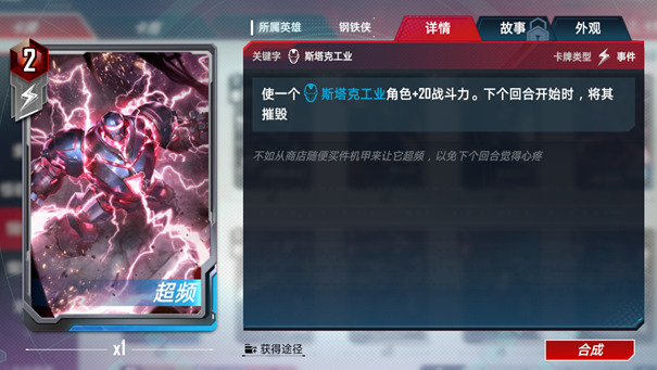 使一个斯塔克工业角色+20战斗力。下个回合开始时,将其摧毁。