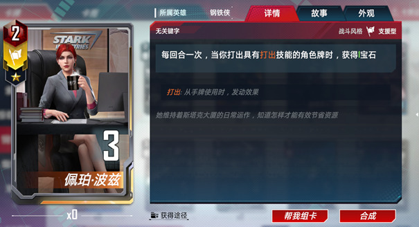 在目前的漫威对决中,一共有20张具有打出能力的角色牌,其中钢铁侠阵营占据了7席。并且这7张卡牌都算是经常可以用到的角色牌。所以佩珀用来赚取宝石的机会还是比较多的。而且来的越早对整体的帮助越大,尤其是二星之后效果立竿见影。唯一的缺憾就是她本身的战斗力不高,不过依然瑕不掩瑜。