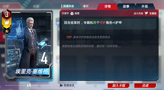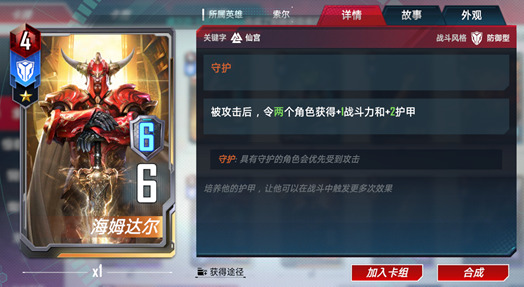守护。阵亡,令一个我方防御型角色★/★★/★★★★+2/+4/+8战斗力,+2/+4/+8护甲