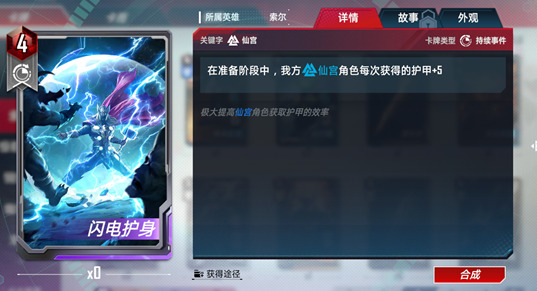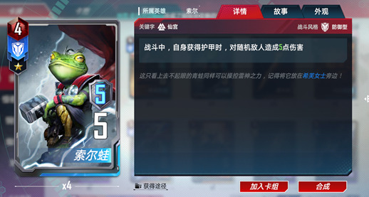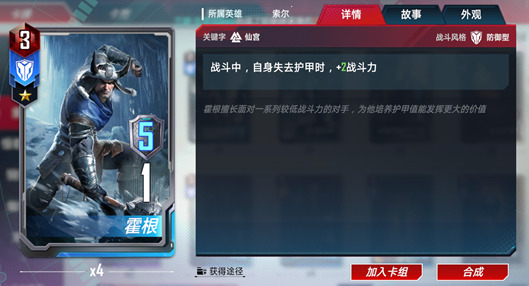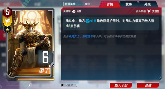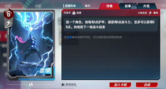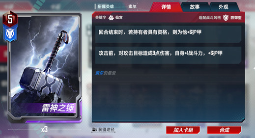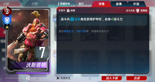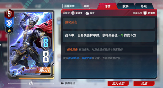 索尔是仙宫护甲流的核心卡牌。失去护甲时可以提升战斗力,让仙宫中许多提升护甲的卡牌变得更有意义。同时强化反击也使索尔的输出提升了一个等级,在防御中造成的伤害甚至比他在行动时还要更高。并且索尔还有复仇者的词条,与美国队长等一众复仇者角色都有不错的联动效果。