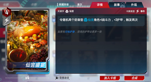 首先这张牌的加分项在于这是一个持续事件,每个回合都可以受益。在准备阶段触发效果可以让之前一些相对平庸的武器和事件获得更高的收益。比如打出龙牙剑的时候会获得9点护甲;打出仙宫盛宴的时候会获得更高的护甲。唯一的问题就是它可能要跟索尔蛙来竞争一个出场席位了,更多的套路还有待大家去开发。