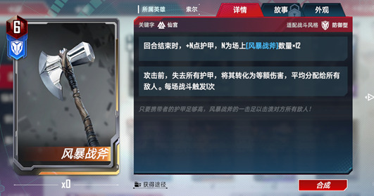 回合结束时,+N点护甲,N为场上[风暴战斧]数量x12。攻击前,失去所有护甲,将其转化为等额伤害,平均分配给所有敌人。每场战斗触发1次。
