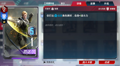 如果希望范达尔作为己方的一个常驻角色,那么只有1星的等级时是做不到的。增益1点战斗力的速度太过缓慢。所以范达尔也并不适合做一名过度型的卡牌,他更适合以核心的方式出现在构筑中。最好是能尽早的将范达尔提升到4星,这样增益的效率会**提高。当我们还没有抽到4张范达尔时,构筑时可以暂时先用其他卡牌代替他的位置。