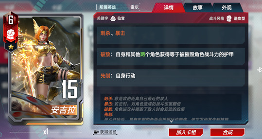 安吉拉集各种关键词于一身,用来针对敌方持续输出型角色的强力卡牌。假设敌方奥丁在守护角色的重重包围下可能对己方有着巨大的威胁,那么如何在他释放法术之前就消灭他呢?安吉拉的先制+刺杀就是一个最好的选择。而且在击杀的同时还可以给己方的角色添加护甲,无论是否属于仙宫体系,安吉拉都是值得信赖的强力角色。