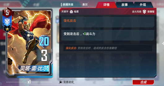 贝塔.雷.比尔又称马面雷神,同样是具备持有雷神之锤的七人中的一位。能力与索尔十分接近,在玩家获得索尔之前使用他作为替代品也还是不错的。而且甚至可以让双雷神同时为己方出战,届时双雷神之锤的闪电一定可以让对手记忆深刻。