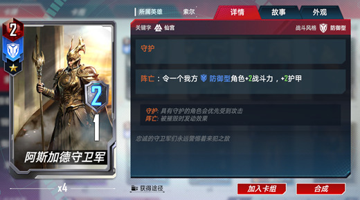 阿斯加德守卫军的隐含收益还是相当高的。他不需要更高的星级就足够帮助到己方其他角色了。在前期的最佳搭档就是阿斯加德天马。不过需要注意的是,当这两张卡牌出现在战场时要注意站位。最好选择阿斯加德守卫军在最左侧,这样就可以稳定的将他送掉,同时稳定的增益到阿斯加德天马上。避免出现天马被刺杀的情况。