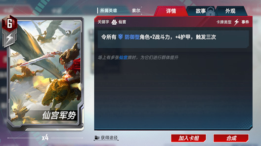 打出,选一个仙宫角色★/★★/★★★★+2/+4/+8战斗力,+2/+4/+8护甲。