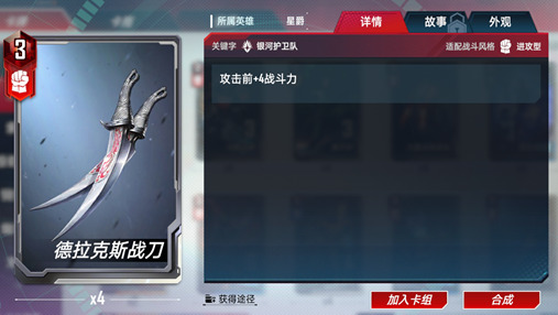 正如它的名字一样,非常适合德拉克斯使用的武器。攻击前+4战斗力对于德拉克斯这种多次行动的角色有很大的帮助。当第一次攻击后角色会因为受到伤害导致战斗力下降,这时德拉克斯战刀+4战力的效果就相当于给角色回血,保证其第二击同样威力十足。同样也非常适用于蜘蛛女、章鱼博士等角色。