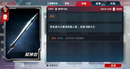 没有增加基础战力让佩戴弑神剑的角色更像是一种孤注一掷的攻击,但是暴击效果以及遇强则强的属性加成却可以增加破敌率。所以弑神剑更像是一个体系下的武器。比如鹰眼和恶型怪组成的暴击体系就非常需要这个武器的出现。他可以使很多战斗力很强但是缺少暴击关键词的角色一跃成为团队的核心。
