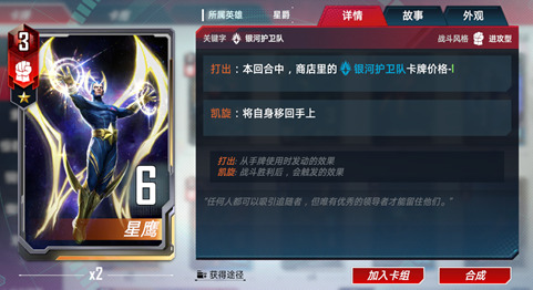 星鹰的减价效果是在本回合内都生效的,也就是说当我们打出星鹰后,即使刷新商店出现的银河护卫队卡牌也会减价。后期宝石比较多的时候刷起来很爽。从经济的角度看来这是一张还不错的单卡,但是他的缺点也比较明显就是自身战力偏低,3费6战力相较于其他阵营的卡牌略微逊色。想要打出凯旋回手需要整体阵容足够出色。