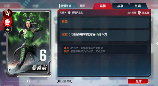 作为特别适合新玩家上手的阵营,银河护卫队卡牌的风格都是那么的简单实用。这里需要注意的是,曼蒂斯给相邻角色提供的增益效果不会像亚当的凯旋一样永久保留。而是会作为当回合的战力体现在场上。试想一下同样具有破敌能力的卡魔拉或者德拉克斯被增益之后的威力,曼蒂斯的效果还是可以让人满意的。并且自身具备暴击能力也让她的破敌有所保障。