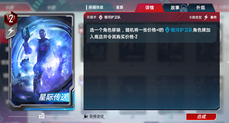 选一个角色移除,随机将一张价格+1的银河护卫队角色加入商店并令其购买价格-2.