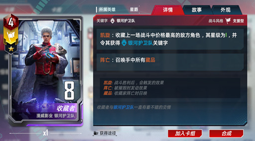 凯旋:收藏上一场战斗中价格最高的敌方角色,其星级为★1/★★2/★★★★4,并令其获得银河护卫队关键字。阵亡,召唤手中所有藏品。
