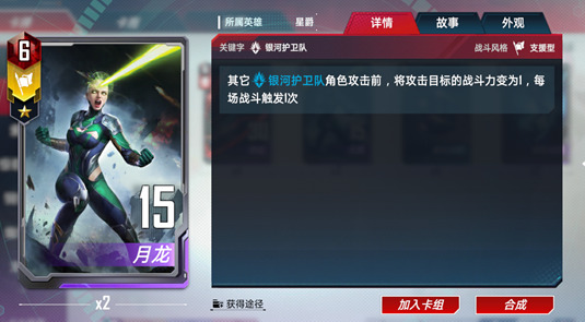 月龙的效果很多时候取决于她的星级。只能有1次将被攻击的目标战力变为1很多时候意义不大。毕竟很有可能第一个被攻击的角色是防御型卡牌,本身攻击力就不高。但是如果2次就很有可能将对方的一名主力输出点迅速击破。总的来说这张卡牌的收益不算稳定,支援型的属性也不容易从对红色有利的银河护卫队技能体系下获得收益。