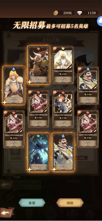 玩家可以进行无限次十连抽,如果你对这次招募不满意,点击重置按钮即可再次进行10连抽,直到你抽到满意为止!点击领取即结束本次的无限召唤并领取所抽到的英雄(最多可招募5名英雄)