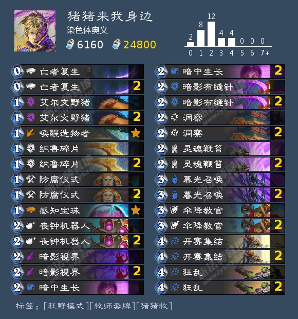 第二个问题,是与为了洞察准确检索而去掉“复制随从”的举动相关联的。即卡一手的复制随从和法术,猪猪在手也不敢下。于是我去掉了所有复制随从,以及复制法术,亡语召唤两个那张法术也去掉了。加入了开赛集结。(我们刚好有123费随从,而且稳定复活猪,不需要猪在场,我觉得对打快攻也有一定作用,就两张带满去测试效果,结果遇不到真人,具体抗快攻效果就不太清楚,可以自己调试)我们召唤猪的方法至此几乎都变成复活法术,这时候反而希望对面解场,也不会因为复制法术或随从卡手。(提一嘴,遇到个任务猎,不解我场上猪猪,给他歪打正着,加上我221没来把我打死了)