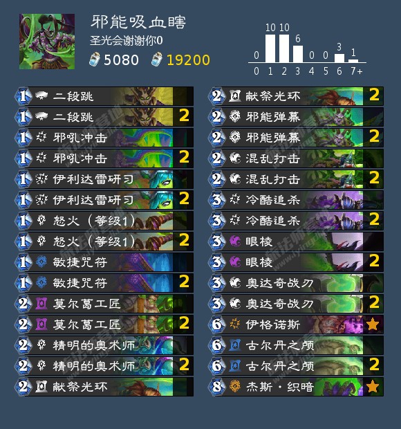 然后是杰斯。首先杰斯释放法术的时候顺序是随机的,所以很多时候对面场上有怪的时候你很难保证邪能弹幕能打到脸,所以算伤害的时候要注意一下。然后杰斯释放的怒火是根据你用的时候的等级放的,所以尽量等2.3级的时候再放怒火吧。本卡组所有邪能法术:邪吼冲击、邪能光环、混乱打击、怒火、眼棱,假设怒火满级再打、邪能弹幕全打脸的话配合杰斯总伤害是40,打绝大多数卡组都够了。