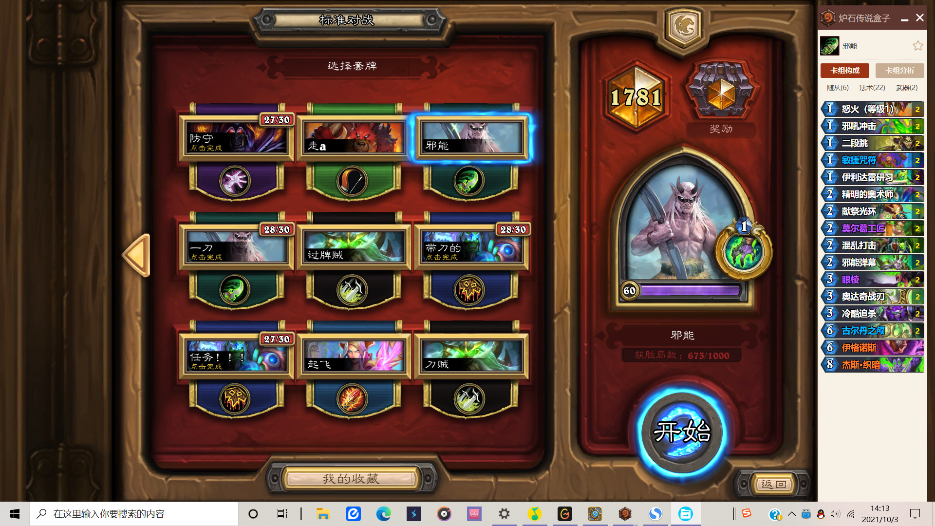 因此我10月只有10星,正是练新卡组的好时机。本来作为盗贼信仰玩家我是想练练以高难度著称的锁喉贼的,但是玩了50多把还是玩不明白,只得作罢。在被各路任务法海盗战超生德超凡德干烂之后,我选择了这套邪能吸血瞎。国庆前两天出去玩了,路上打了几把任务贼,感觉一般,就换了瞎,然后一路上了传说,手感很棒,就想着写这篇攻略和大家交流一下思路和细节(话说现在大家的水平都好高,10月3号上传说就只有1700多名了)
