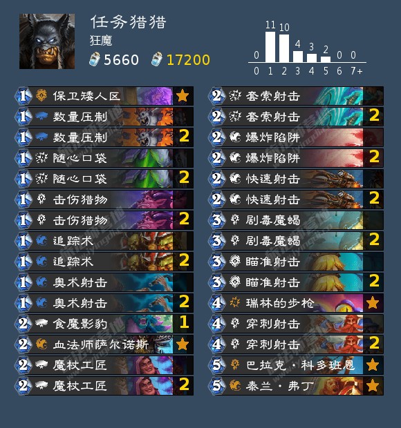 在回坑标准之后,用我的本命职业——法师,在版本初期趁乱使用任务法卡组以60%的胜率上了传说,刚上传说时的排名在6000+。由于脱坑期间已经更迭了6个版本,于是上了传说之后我就开始本着娱乐的心态,在尝试不同卡组的同时熟悉目前的标准环境。于是,很快就从6000名掉到了60000名(-_-||),在这个过程中发现,现在的天体环境跟我脱坑时变化极大:环境整体大幅提速,弱化了随从交换,各种组合技(自闭)卡组泛滥。就连曾经的万能上分卡组t7猎,如今也被开玩笑的称为“控制猎”。补丁上线后,看其哥的直播时,我发现了任务猎这套卡组。拍完任务之后顺滑的走A,让我想起了曾经猖獗一时的毒瘤宇宙牧(其实也是我最喜欢的一套卡组)。于是便合了张猎人的任务,从传说6w名开打,计划打100局,看一下能打到一个什么名次。