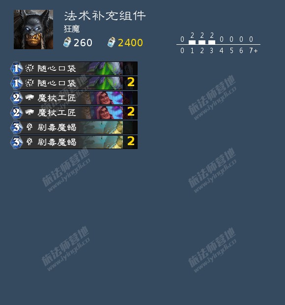 魔杖工匠和剧毒魔蝎在补充法术的同时,也能作为2、3费的前期生物平滑曲线,进行随从交换。剧毒魔蝎也可以配合随心口袋找到的集群撕咬处理身材比较大的随从。随心口袋控费找零的情况下,可以稳定找到0费法术,用于走A和灵活解场;也可以用随心口袋搏梦想,讲故事。