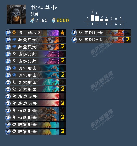 纯任务术就是带黑眼和灵魂窃贼的那套,优势对局。打法同对阵任务法类似,多射箭,尽可能的打满伤害,通常能够在对面启动前抢死。注意尽可能早的用掉魔杖工匠和击伤猎物,防止在对面血量不健康时,己方场上的小生物成为纳斯雷兹姆之触和吸取灵魂的目标。同时还有一点需要注意的是,爆炸陷阱会帮助术士做任务,所以不考虑优先使用这张牌。